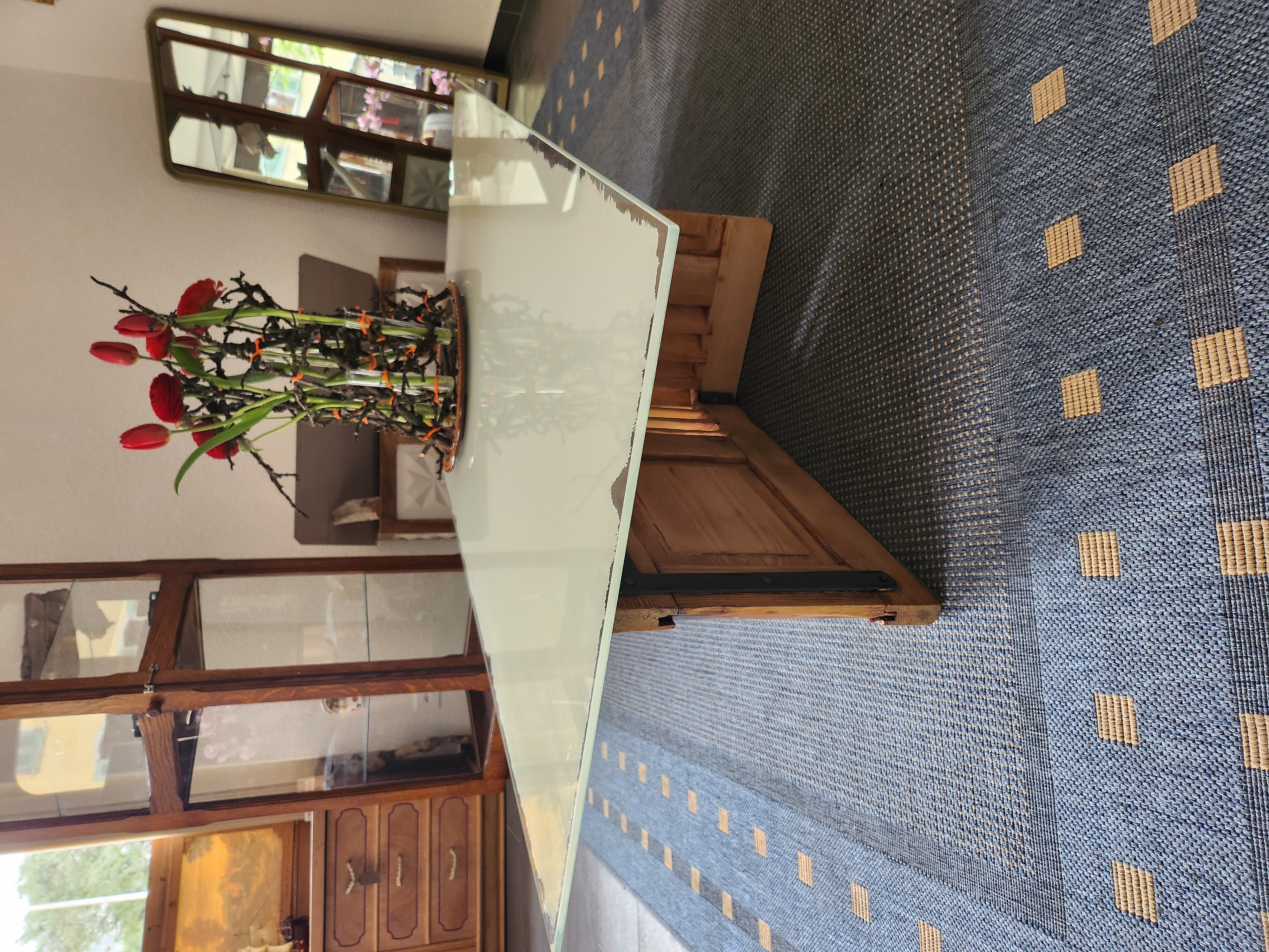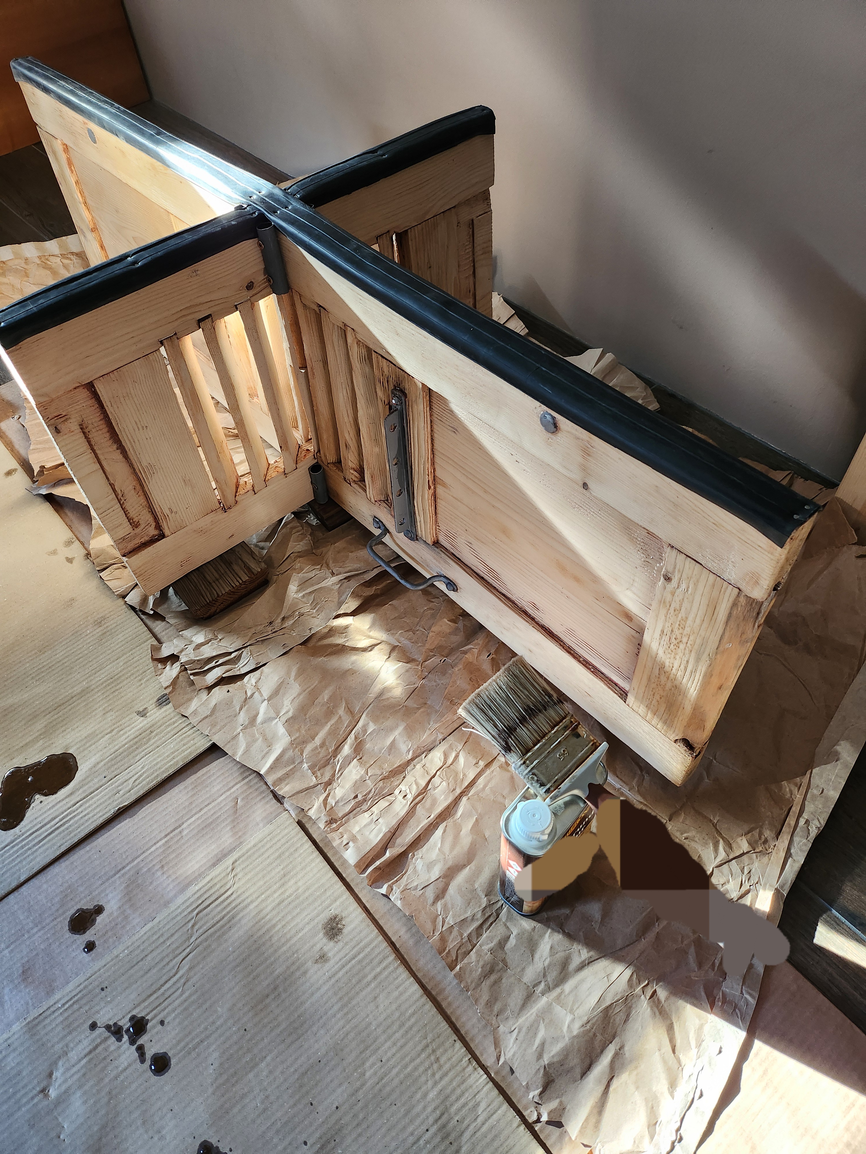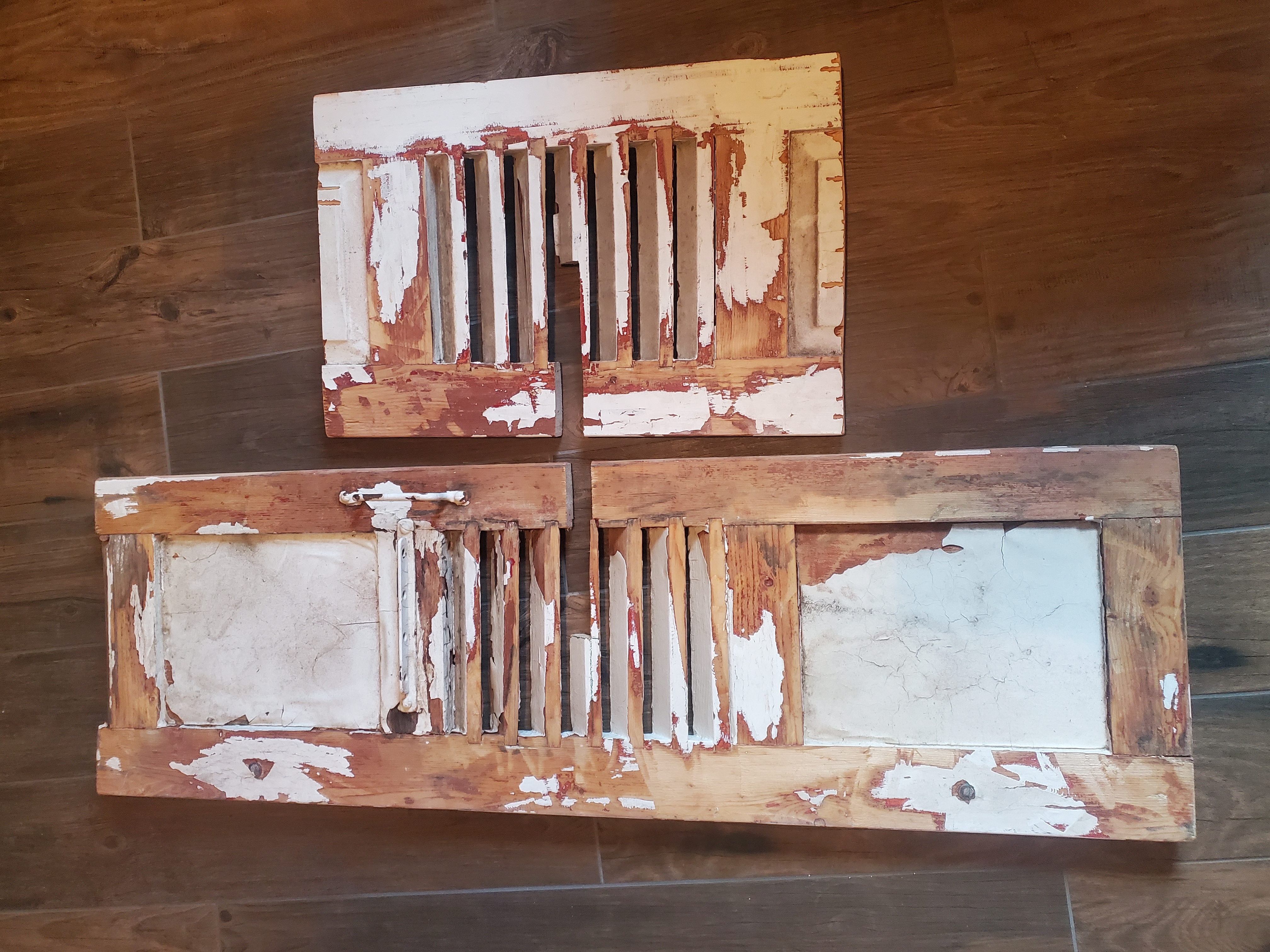 Les volets qui ont fini par s'emboîter. En faite j'avais envie de créer une table basse en verre. Ces volets en bois massif m'ont permis de pouvoir les sabler sans les endommager. Je les avais au préalable sciés, poncés et rabotés de façon à ce qu'ils puissent s'emboîter et se disloquer à tout moment afin d'avoir une table basse en verre pliable. Je me suis alors rendu compte que le revêtement en bois contre le plateau en verre était glissant. Il m'est alors venu cette idée de clouer et coller deux couches de chambre à air. Elles permettent un excellent contact bois-verre. La croix a aussi été renforcée à sa base avec des chutes de tuyaux en acier dans le but de bloquer les éventuelles torsions.