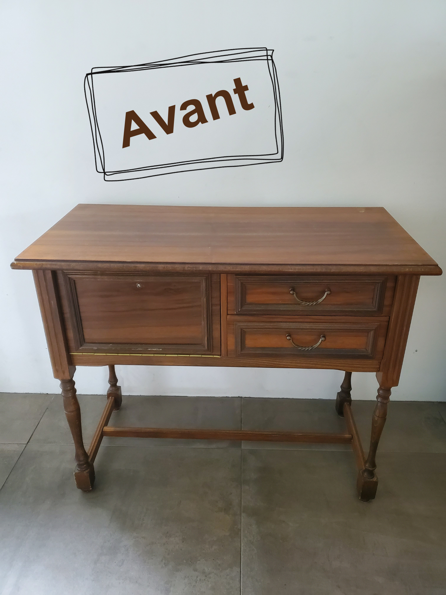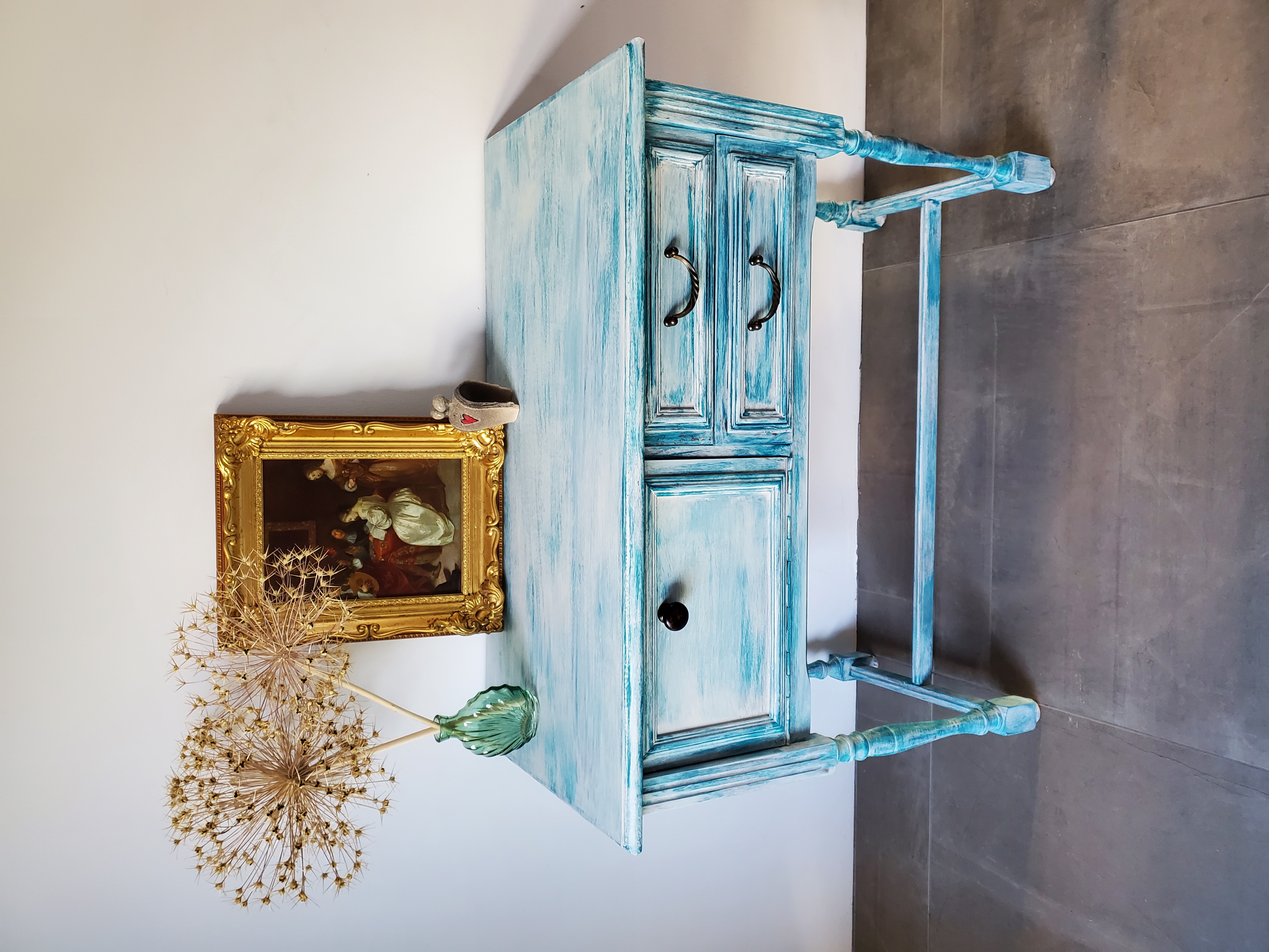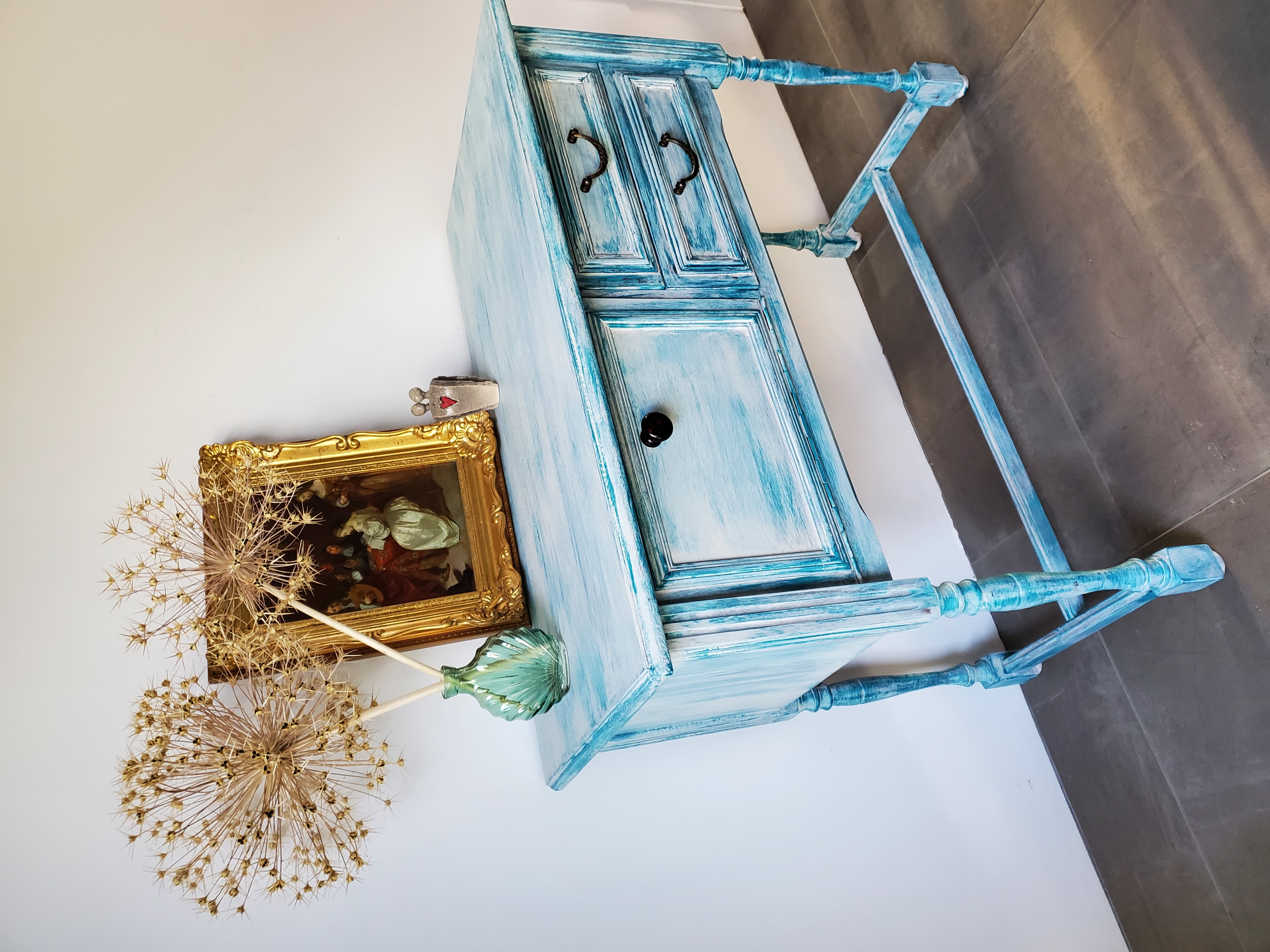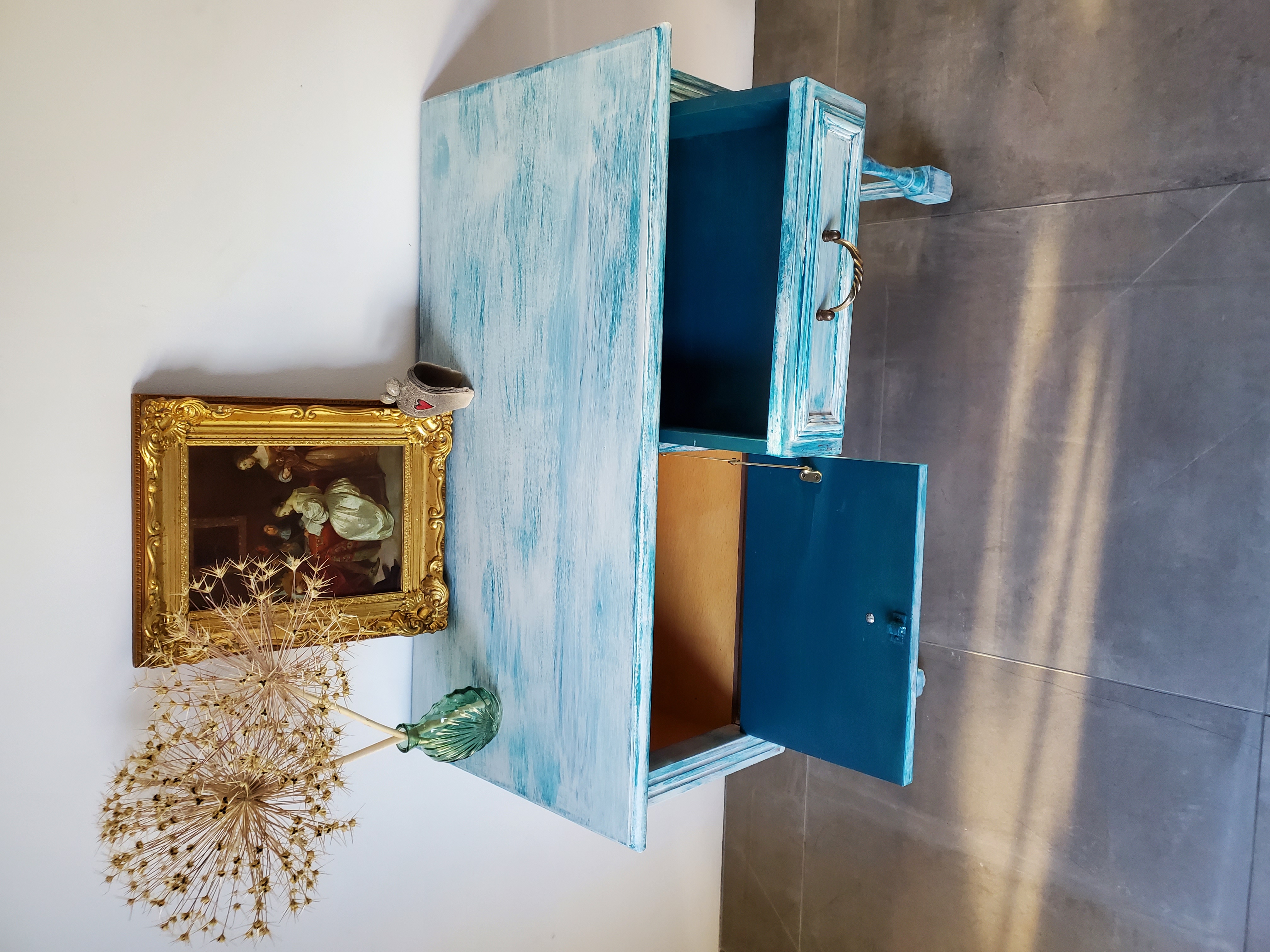 Cette petite commode a été peinte en blanc pour ensuite accueillir une finition en bleu. L'intérieur a aussi été travaillé en différente teinte. Epongée, frottée, et même calinée lorsque le rendu fut arrivé à la hauteur de ce que j'imaginais dans ce ciel bleu rempli de stratus,...cumulus nimbus blanc. Les poignées en fer forgées légèrement dorée ainsi que le bouton nacré noir donne un joli contraste à travers ce ciel peint.