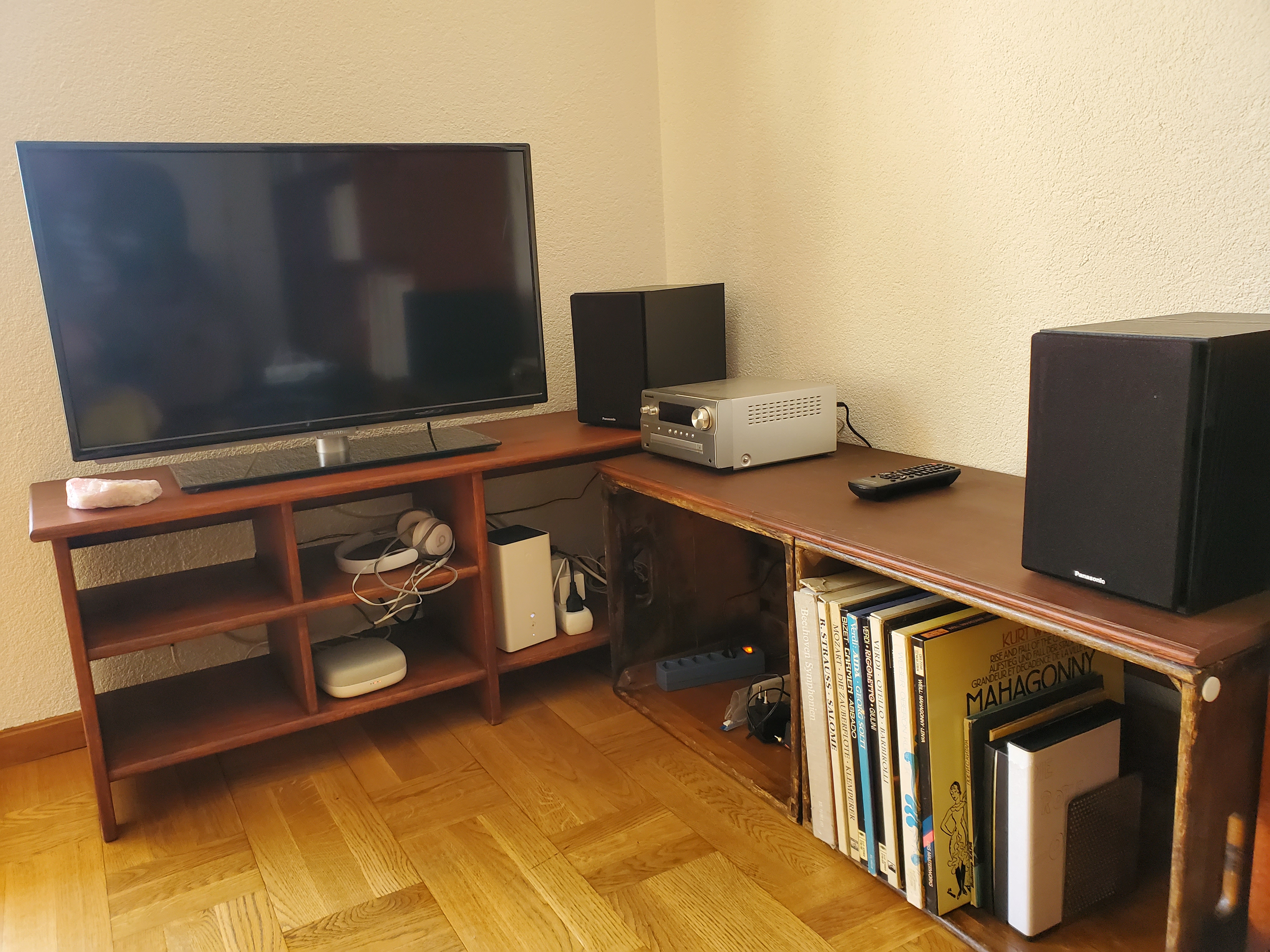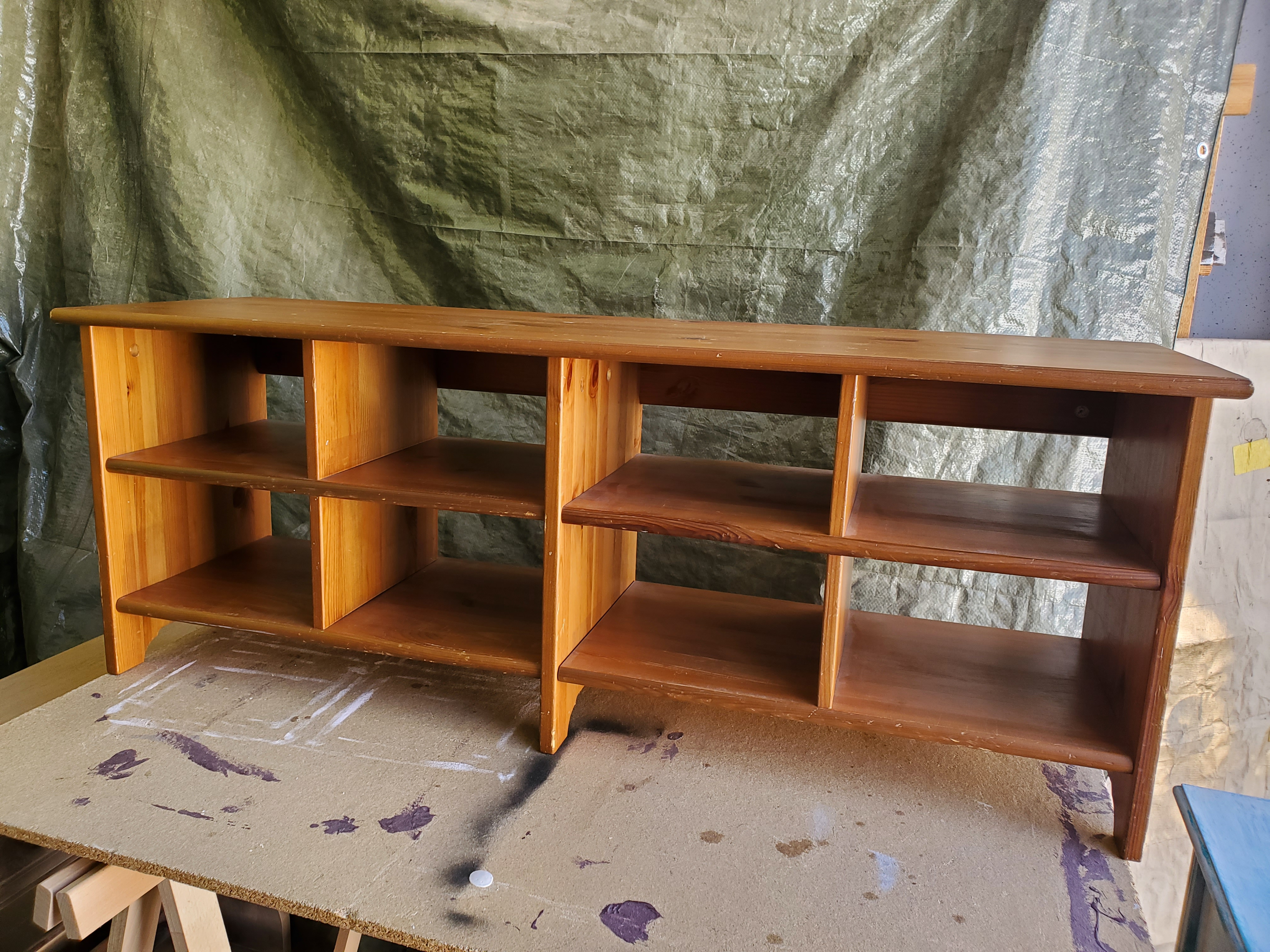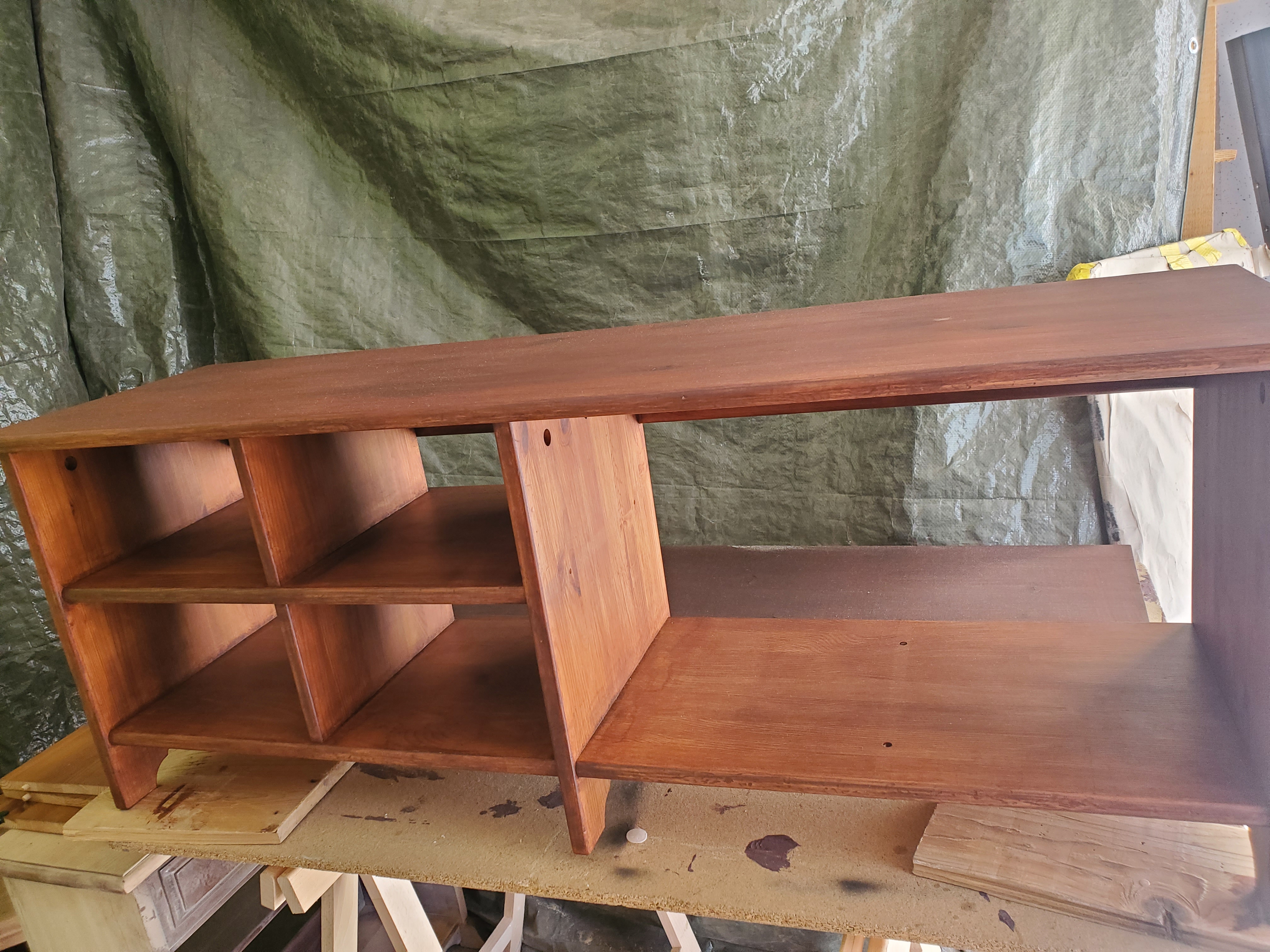Le branché est une demande spécifique pour un coin télé. Il se compose d'une étagère poncée et vernie et pour intéger les deux caisses à pommes qui ont une histoire particulière pour leur propriétaire, une plaque vernis dans la même teinte à été disposée sur le dessus.