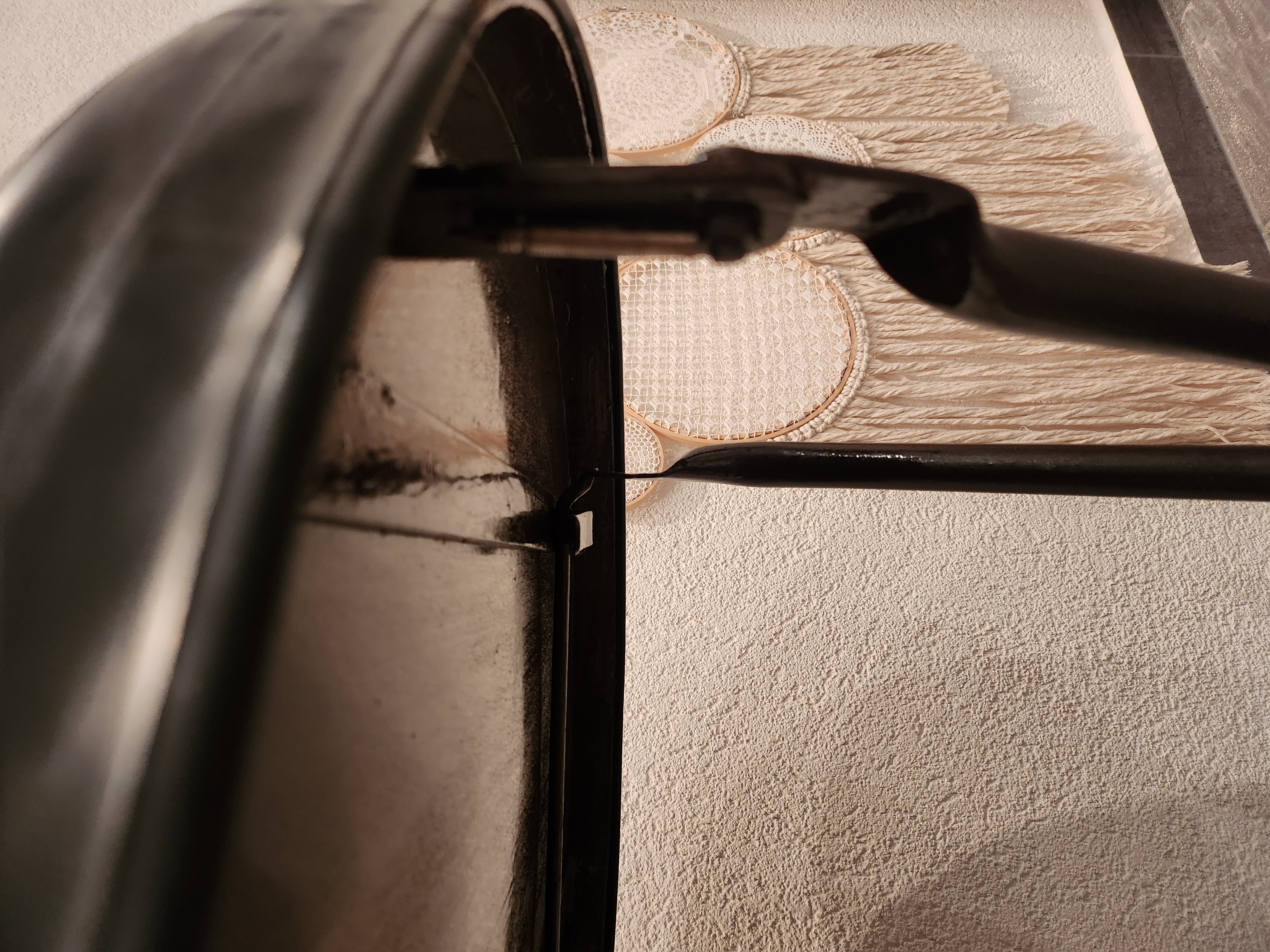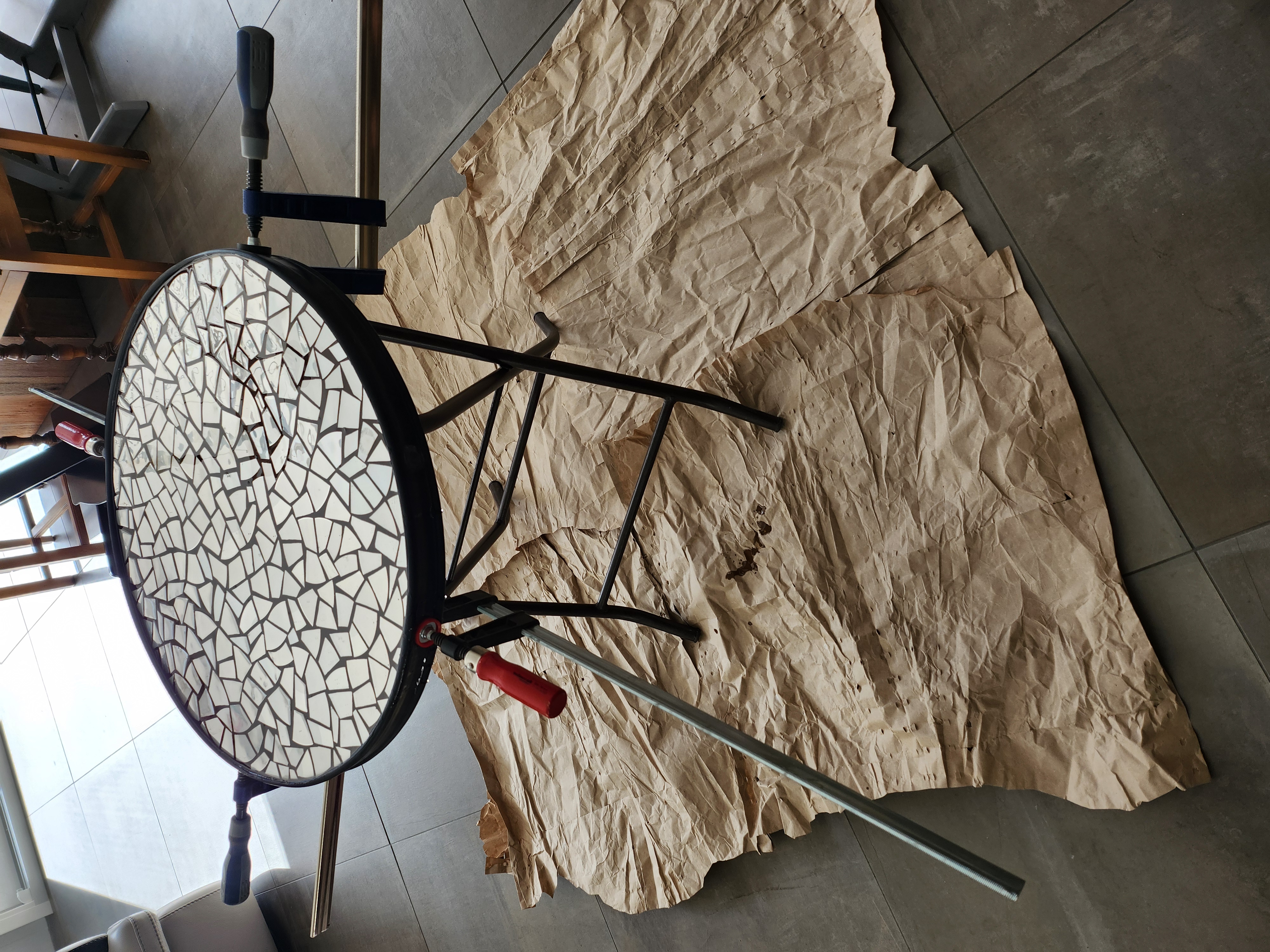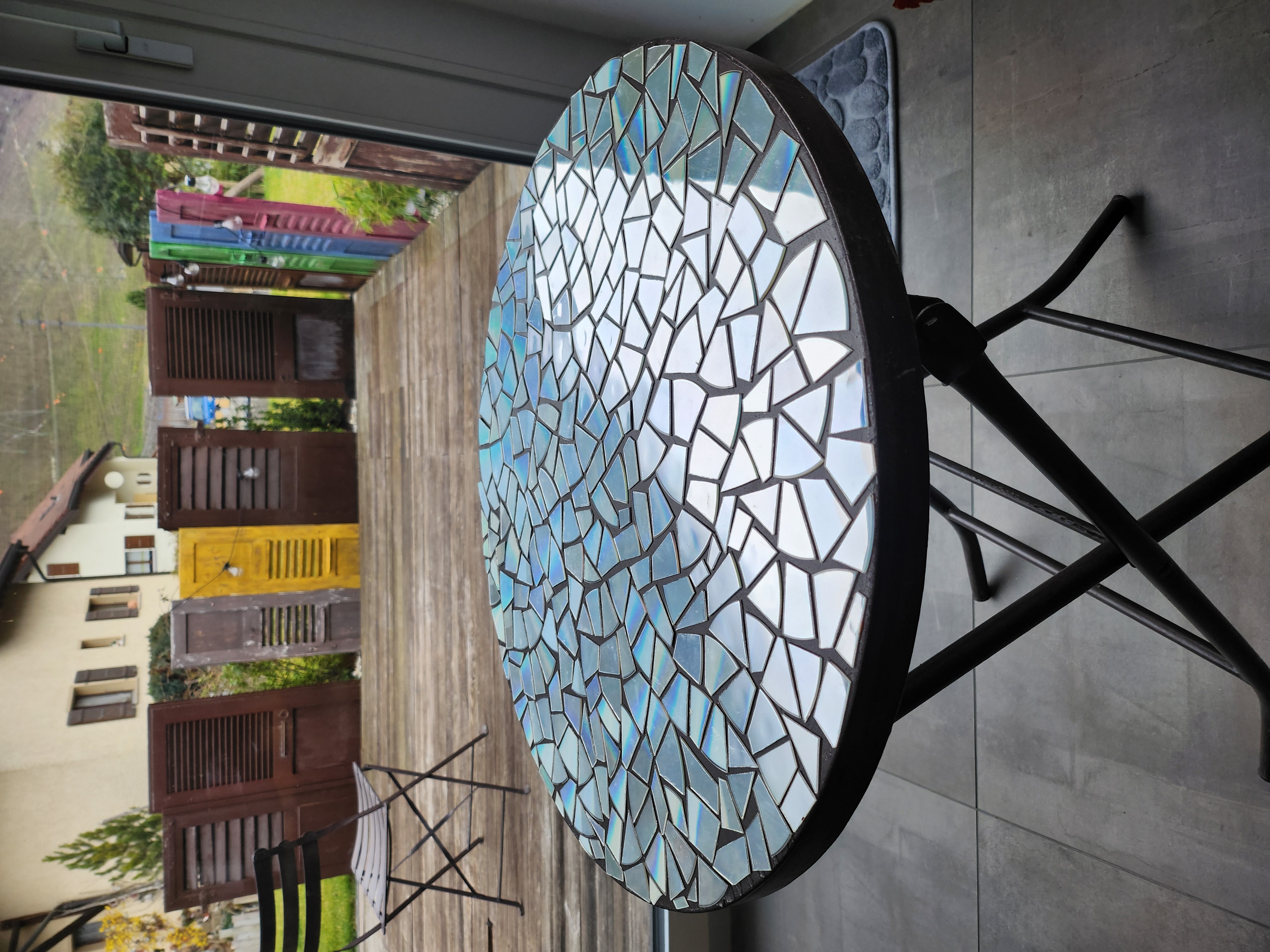 Table extérieure en acier qui en avait juste ras-le-bol d'être rouillée. Elle a alors souhaité un shampoing intégral 3 fois d'affilée de type brun résistant aux intempéries. A la suite de cette première envie, elle s'est imaginée briller avec des reflets arc-en-ciel. Du coup on a réuni des vieux CD qui parfois ne fonctionnaient plus avec un doux mélange de plein d'artistes et types de musiques différents. Aujourd'hui elle rayonne de belles énergies musicales. Le pourtour a été réalisé avec une chambre à air qui épouse parfaitement la circonférence de ce CD géant. Une petite touche discrète a été dissimulée sous la table en gardant la valve d'origine afin de la sceller dans un recoin. Elle a même eu le droit à une couche de résine sur les morceaux de CD.