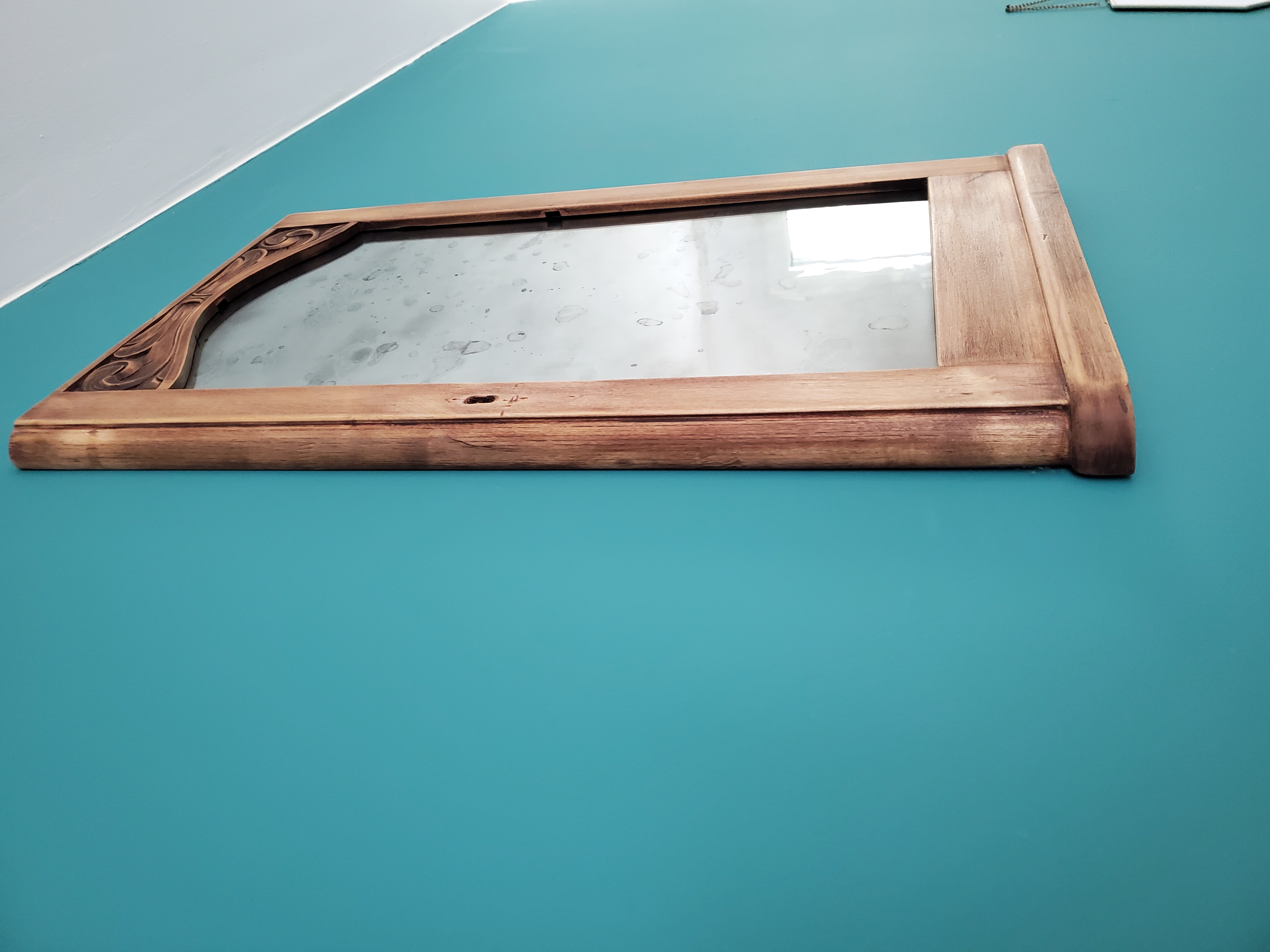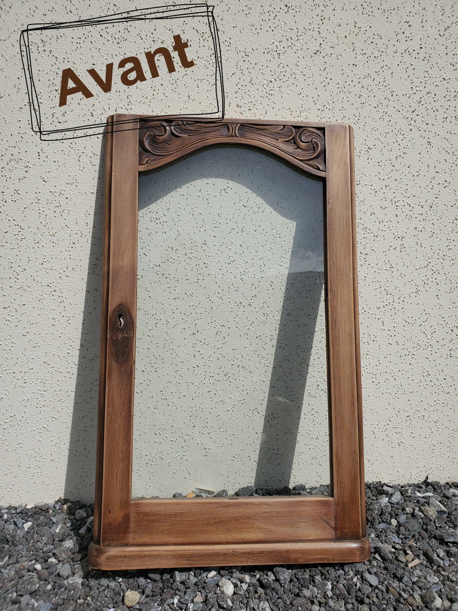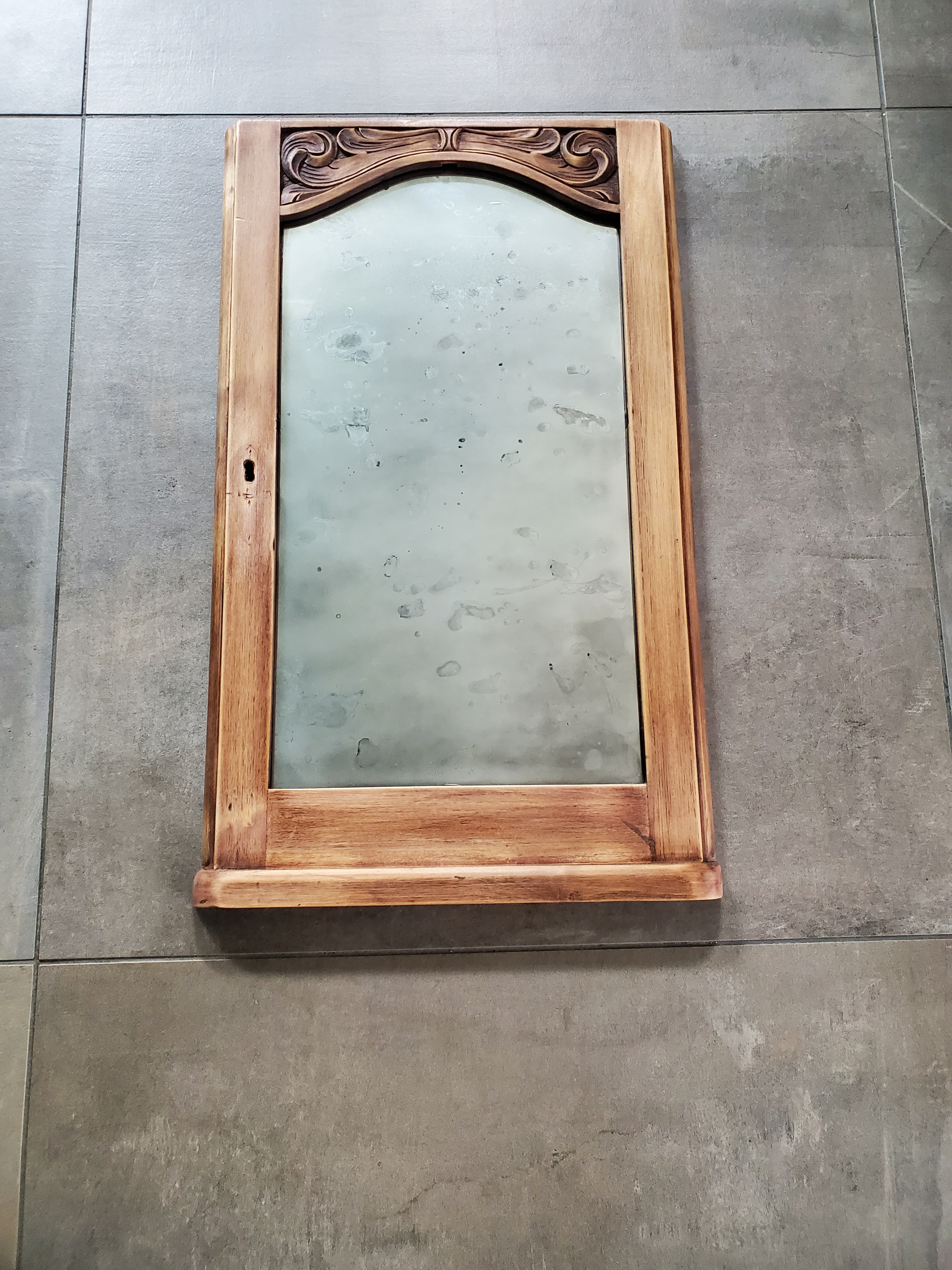 Hohoho mon beau miroir, dis moi qui est le plus beau,.... Ce miroir unique a été crée à parti d'une vitre démontée sur un ancien vaisselier. Des gouttes d'eau vinaigée ont été aspegrées pour donné un effet veilli... Et tadam, ça fait tout son effet...